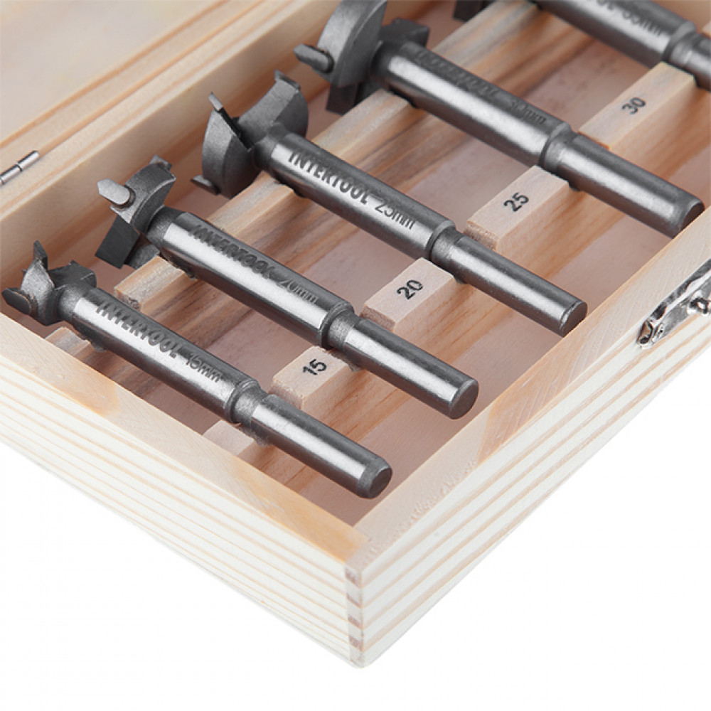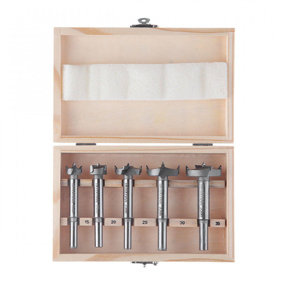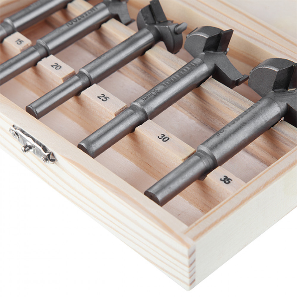 Даний набір містить 5 різних за діаметром фрез: 15, 20, 25, 30, 35 мм. Свердла Форстнера (фрези Форстнера) легко справляються з брусом, товстою фанерою або МДФ листами, робить зріз потрібного діаметра гладким та без сколів. Самовідцентроване вістря забезпечує додаткову точність свердління. Бічні різці підрізають волокна по краю, після чого різальна крайка рівно зрізує сам матеріал без деформації. Це робить отвір гладким без додаткових зусиль та витрат.