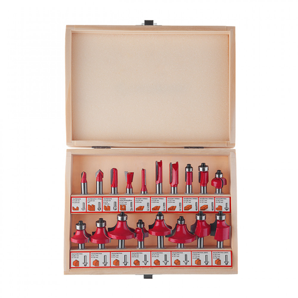 Фрези - різальні інструменти з одним або декількома різальними лезами, призначені для фрезерування, вибірки пазів різної форми, виконання шпонкового паза тощо. Даний набір містить 18 різних за формою фрез. Комплект універсальний тим, що в ньому підібрані фрези основних розмірів та різних типів, що дозволяє виконувати широкий спектр завдань з фрезерування.