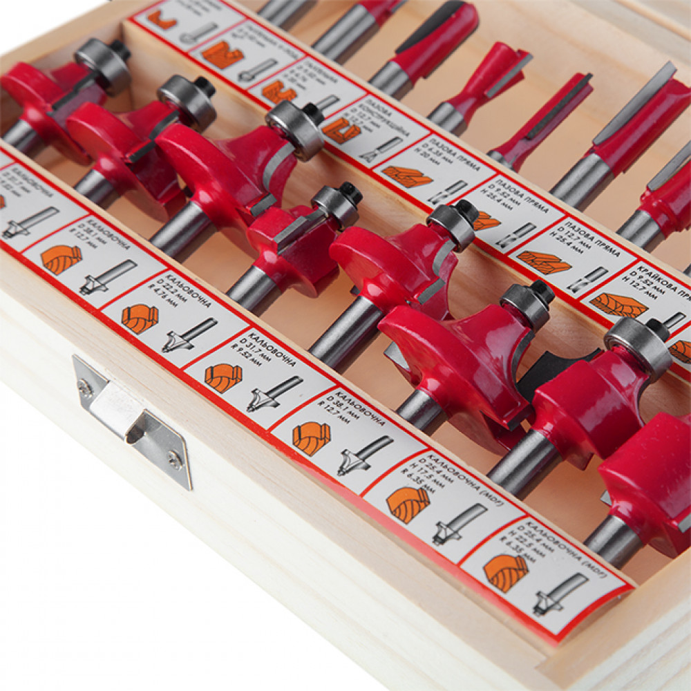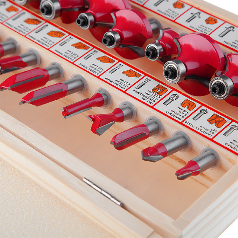 У наборі HT-0073 представлені кілька видів фрез, які найчастіше бувають необхідні у побуті. Багато фрез, так чи інакше, призначені в основному для виробництва меблів, віконних рам, паркету тощо. Такими фрезами в домашніх умовах ми не користуватимемося самостійно. А ось, врізати замок у дерев'яні двері, зробити своїми руками табурет, полицю для книг - можна виконати і в домашніх умовах завдяки досить простій формі фрез.