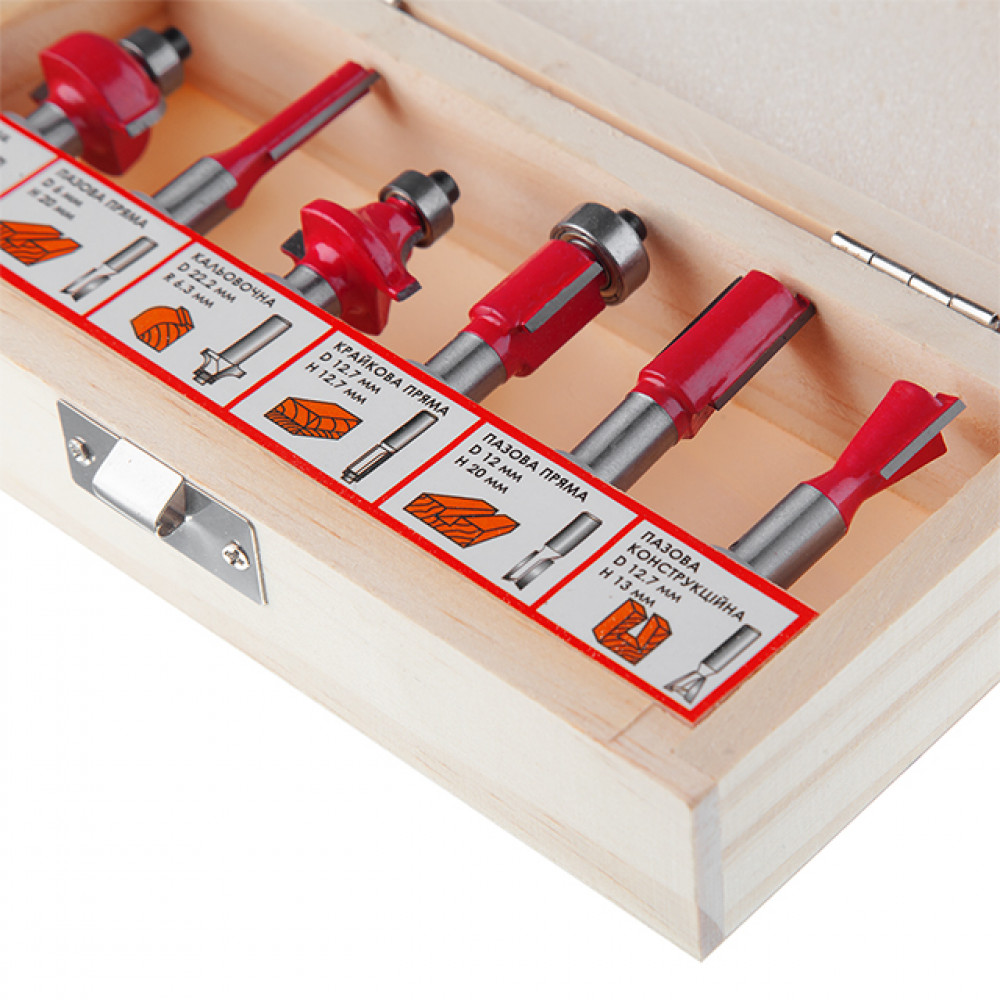 Даний набір містить 6 різних за формою фрез. Комплект універсальний тим, що в ньому підібрані фрези основних розмірів та типів, що дозволяє виконувати основні завдання з фрезерування.