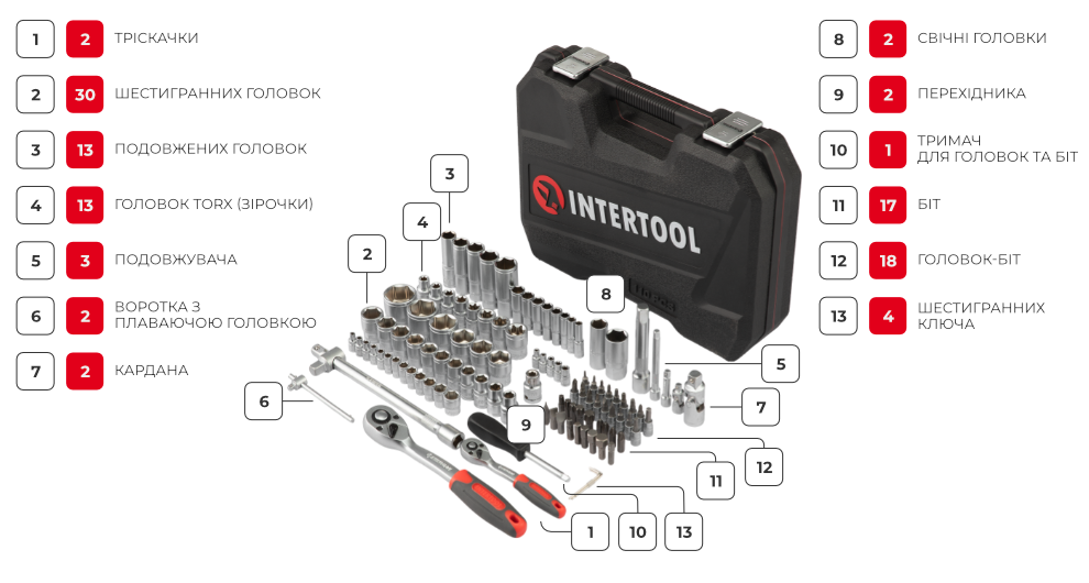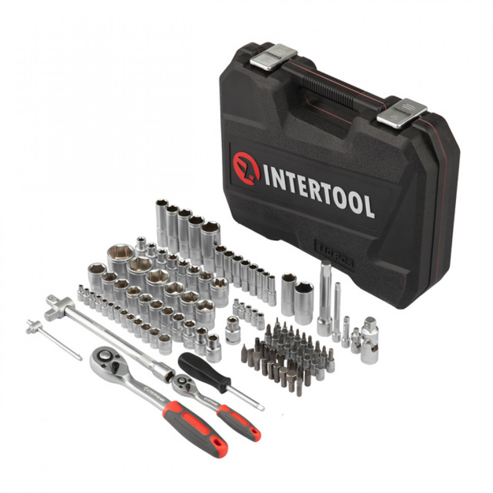 Набір включає 109 елементів для вирішення будь-якого завдання відкручування, закручування кріплень. Для різних діаметрів кріплень є цілий арсенал шестигранних торцевих головок від 4 до 32 мм.