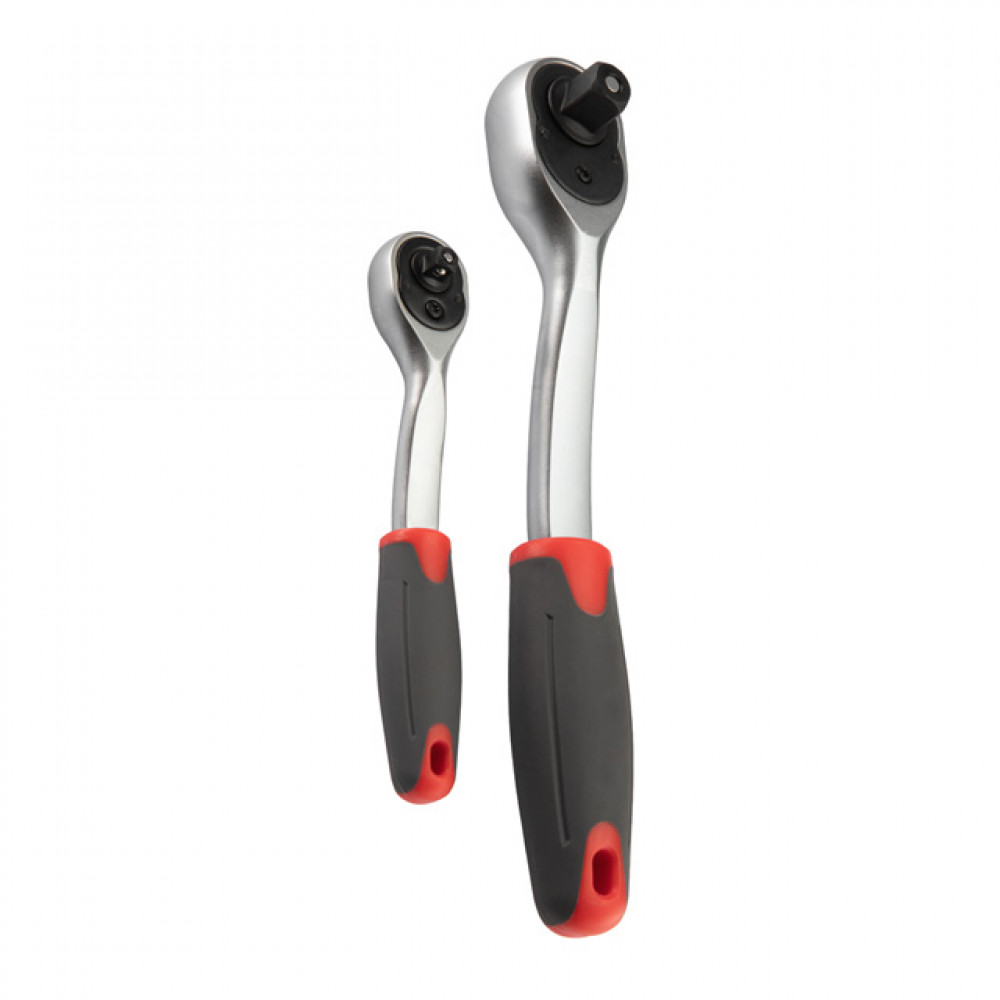 У наборі дві тріскачки з посадковими квадратами 1/2” та 1/4”, з реверсом, кнопкою для скидання та фіксації головок. Корпус тріскачок став більшим і міцнішим, виробляється з Cr-V сталі, а губки храповика з Cr-Mo сталі. Храповик на 72 зуби забезпечує м'якість ходу та дозволяє працювати в умовах обмеженого простору. Прогумована двокомпонентна ручка надійно сидить у руці і не вислизає. Сплощений профіль та вигнута форма тріскачки дозволяє дістати кріплення у важкодоступних місцях.
