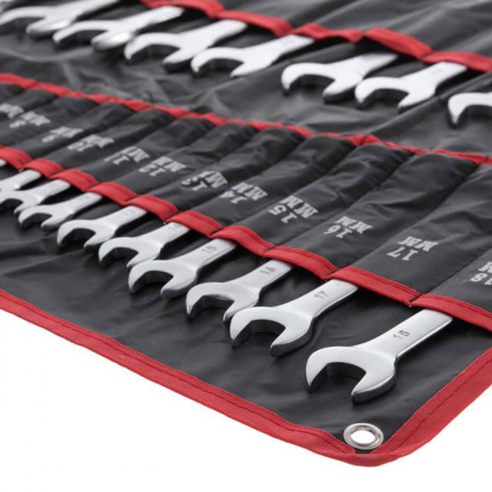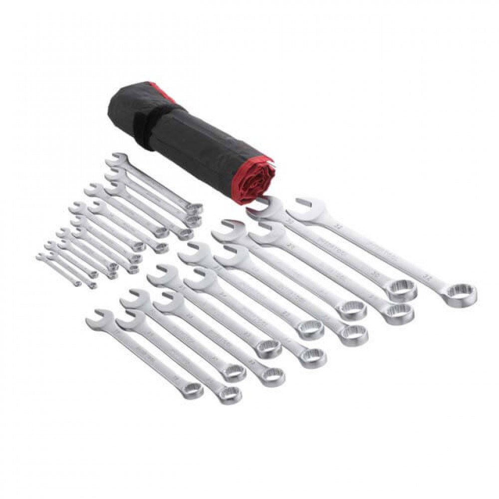 INTERTOOL HT-1200 — это набор из 25 комбинированных ключей, каждый из которых представляет собой сочетание рожкового и накидного гаечного ключа. Размерная линейка набора — 6; 7; 8; 9; 10; 11; 12; 13; 14; 15; 16; 17; 18; 19; 20; 21; 22; 23; 24; 25; 26; 27; 28; 30 и 32 мм. Обе стороны ключей имеют одинаковый размер головки. Широкий выбор размеров позволит подобрать наиболее удобный вариант в каждом конкретном случае. Ключи изготовлены из хром-ванадиевой стали. Её физические и химические свойства обуславливают высокую устойчивость к механическим нагрузкам, коррозионную стойкость и твердость. Кроме того, эта легированная сталь обладает благоприятным модулем упругости. Удобная форма и изгиб рукоятки ключа обеспечивают оптимальные условия для приложения усилия, благодаря чему легко можно закрутить/открутить крепежный элемент. Ключи поставляются в удобном сворачивающемся чехле с кармашками под ключ каждого размера.